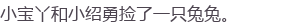 几个小孩儿叽叽喳喳,田巧花惊讶的看着绍勇和宝丫,说:“你们两个行啊,竟然还能捡到兔子?”